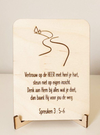 Houten kaart Spreuken 3:5-6Kaartjes van hout met inspirerende bijbelteksten.