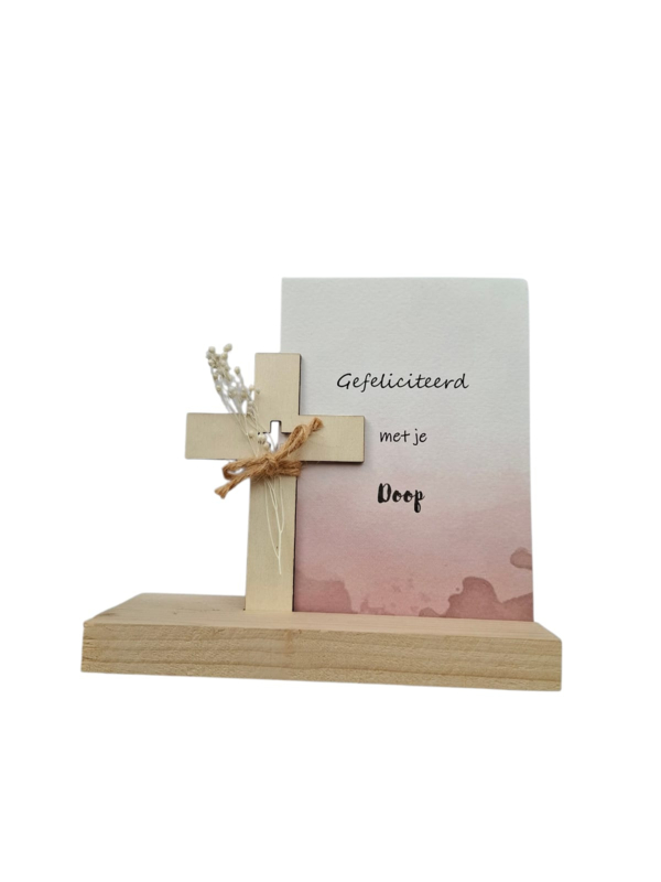 Standaard met kruisje en kaart gefeliciteerd met je doop