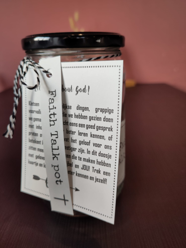 Artikelnummer: 428Kletsen over dagelijkse dingen, grappige voorvallen en dingen die we hebben gezien doen we gemakkelijk. Maar echt eens een goed gesprek met inhoud, de ander beter leren kennen, of praten over God en wat het geloof voor ons betekent kan een stuk lastiger zijn. In deze pot zitten meer dan 100 vragen die te maken hebben met geloven, God, de Bijbel en JOU! Trek een kaartje en leer de ander beter kennen en jezelf!