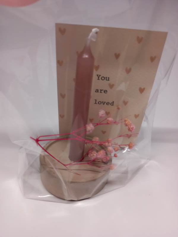 Wat een lief cadeautje! Deze stoere cementhouder met een potloodkaarsje en een lief kaartje met een droogbloemetje erbij. Dit is zo klaar om te geven!