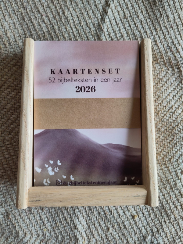 In deze eikenhouten staande houder past de hele set van 52 Bijbelkaarten in een jaar in.