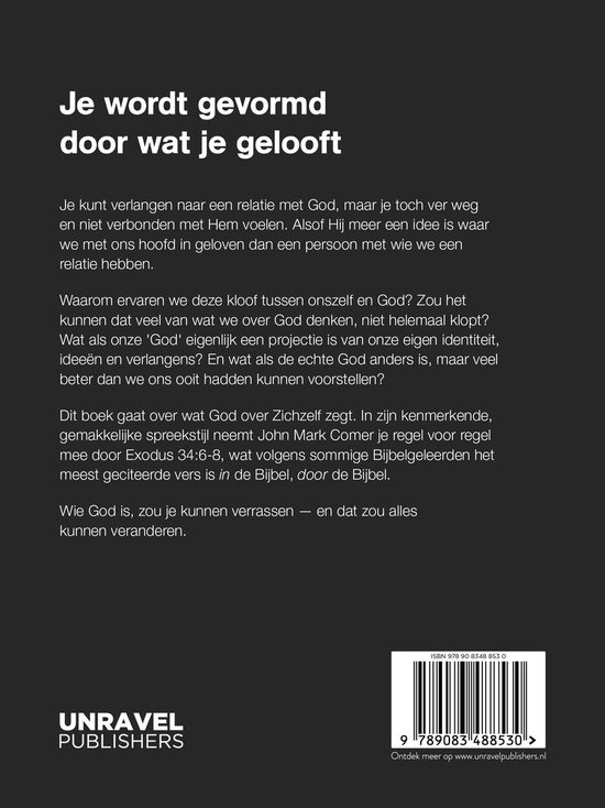 Je wordt gevormd door wat je gelooft. Je kunt verlangen naar een relatie met God, maar je toch ver weg en niet verbonden met Hem voelen. Alsof Hij meer een idee is waar we met ons hoofd in geloven dan een persoon met wie we een relatie hebben. Waarom ervaren we deze kloof tussen onszelf en God? Zou het kunnen dat veel van wat we over God denken, niet helemaal klopt? Wat als onze 'God' eigenlijk een projectie is van onze eigen identiteit, ideeën en verlangens? En wat als de echte God anders is, maar veel beter dan we ons ooit hadden kunnen voorstellen? Dit boek gaat over wat God over Zichzelf zegt. In zijn kenmerkende, gemakkelijke spreekstijl neemt John Mark Comer je regel voor regel mee door Exodus 34:6-8, wat volgens sommige Bijbelgeleerden het meest geciteerde vers is in de Bijbel, door de Bijbel. Wie God is, zou je kunnen verrassen — en dat zou alles kunnen veranderen.
