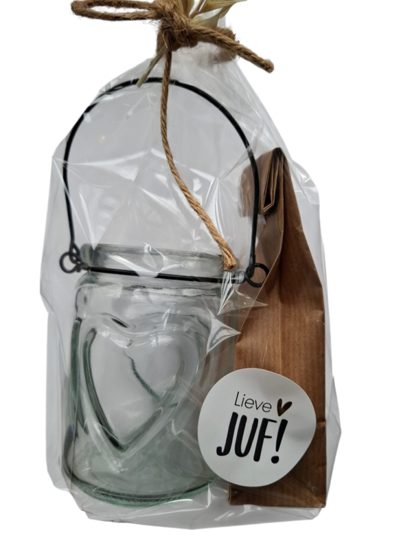 Glazen waxinelichtje met waxkaars voor jufBij dit cadeausetje zit een zakje met waxzand en een lont om zelf het glaasje mee te vullen.