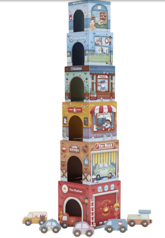 Stapelblokken met auto'sLittle Dutch Stapeltoren – Inclusief 6 Auto’s – Hout