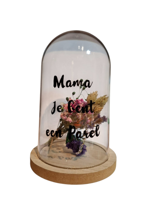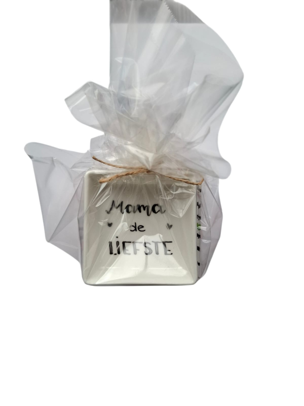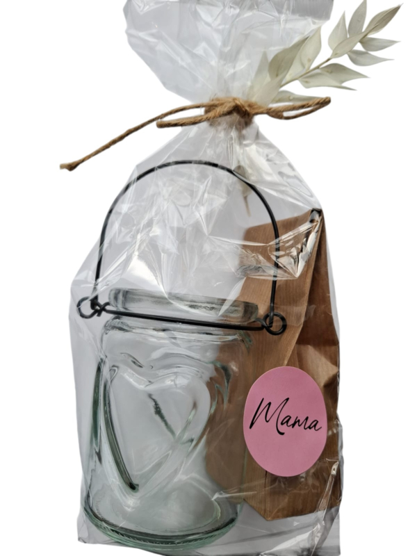 Waxinelichtglaasje voor moederdagWordt geleverd in verschillende verianten voor moeder en verpakt in celefaanpapier geleverd.